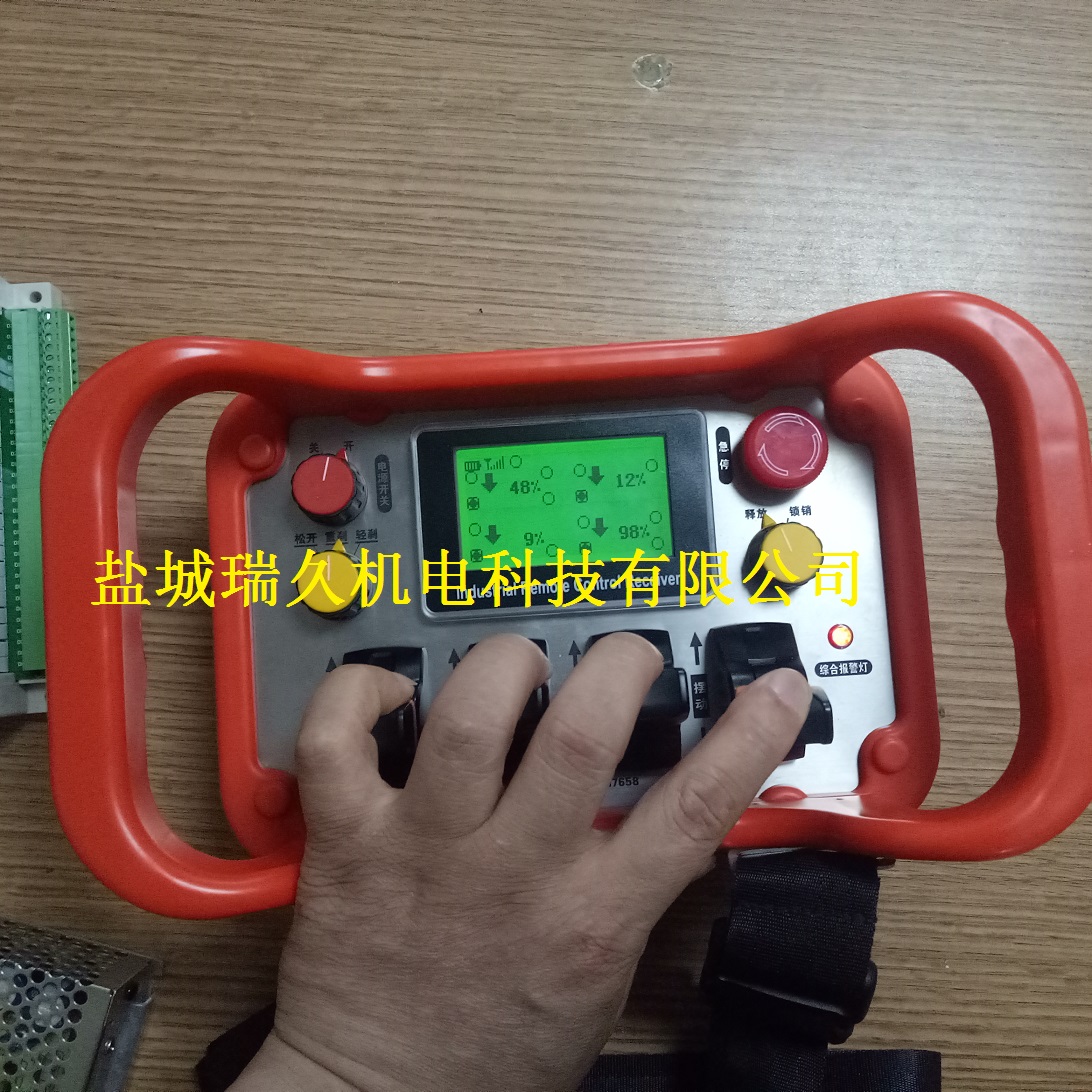 遙控器發(fā)射器采用腰跨式結(jié)構(gòu),三位兩通手動復(fù)位撥鈕開關(guān)1只,兩位一通手動復(fù)位旋鈕電源開關(guān)1只,兩位兩通手動復(fù)位旋鈕開關(guān)1只,蘑菇頭急停按鈕1只?;魻柲M量推桿4只,各輸出1組0-10V及正反兩個繼電器常開點。遙控距離>150米,接收器電源電壓:DC24V。遙控器包含發(fā)射器和接收器各1只。