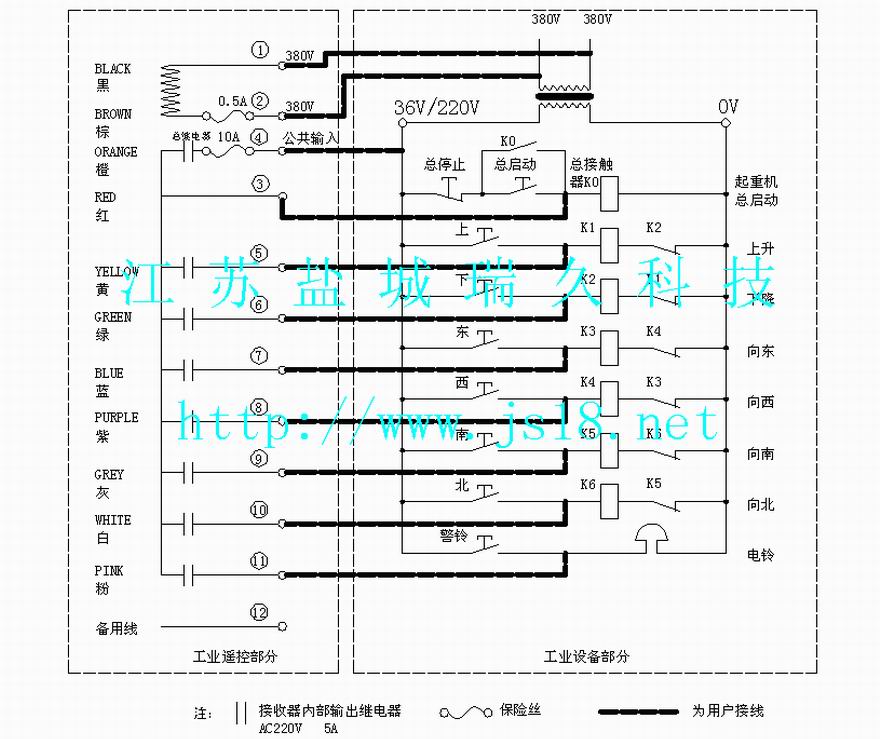 可選配外接延長(zhǎng)天線將天線引至控制箱外 https://item.taobao.com/item.htm?ft=t&id=628753858754 臺(tái)灣禹鼎起重機(jī)遙控器F21-E1B 操作說(shuō)明: *具有8只操作按鍵,其中6只單速按鍵,1個(gè)啟動(dòng)/警鈴,1只總停 *控制點(diǎn)數(shù)達(dá)6個(gè) *帶有電池電壓警示裝置,在電壓不足時(shí)能自行切斷電路。 *安全鑰匙開(kāi)關(guān),防止未授權(quán)者使用。 *可由電腦接口設(shè)定內(nèi)部功能 *上/下、東/西、南/北可設(shè)定為是否互相抑制。 *備用1鍵可設(shè)定為開(kāi)機(jī)、加速、捺跳、普通等功能。 臺(tái)灣禹鼎起重機(jī)遙控器F21-E1B 規(guī)格參數(shù): 控制距離:可達(dá)100米 安全碼:43億種以上出廠永不重復(fù) 使用溫度:-25℃至+70℃(不考慮電池耐溫) 防護(hù)等級(jí):IP65 發(fā)射器電源:直流3V(2節(jié)堿性5號(hào)電池可使用4個(gè)月) 接收器電源:交流380V/220V/36V可選擇,或直流12V/24V 輸出觸點(diǎn)容量:5安培全密封式繼電器輸出(使用交流250V/10A繼電器,5安培保險(xiǎn)絲)。 臺(tái)灣禹鼎起重機(jī)遙控器F21-E1B 標(biāo)準(zhǔn)配置: *發(fā)射器1支(含背帶) *接收機(jī)1部 *接收機(jī)自帶1米連接電纜 *操作及維護(hù)手冊(cè)1本 臺(tái)灣禹鼎起重機(jī)遙控器F21-E1B 用途:適用于單鉤、單速電動(dòng)葫蘆或葫蘆式行車,MD型電動(dòng)葫蘆,不帶大車的固定式行車及6個(gè)接點(diǎn)以下的工業(yè)控制遙控用。 臺(tái)灣禹鼎起重機(jī)遙控器F21-E1B接線圖: