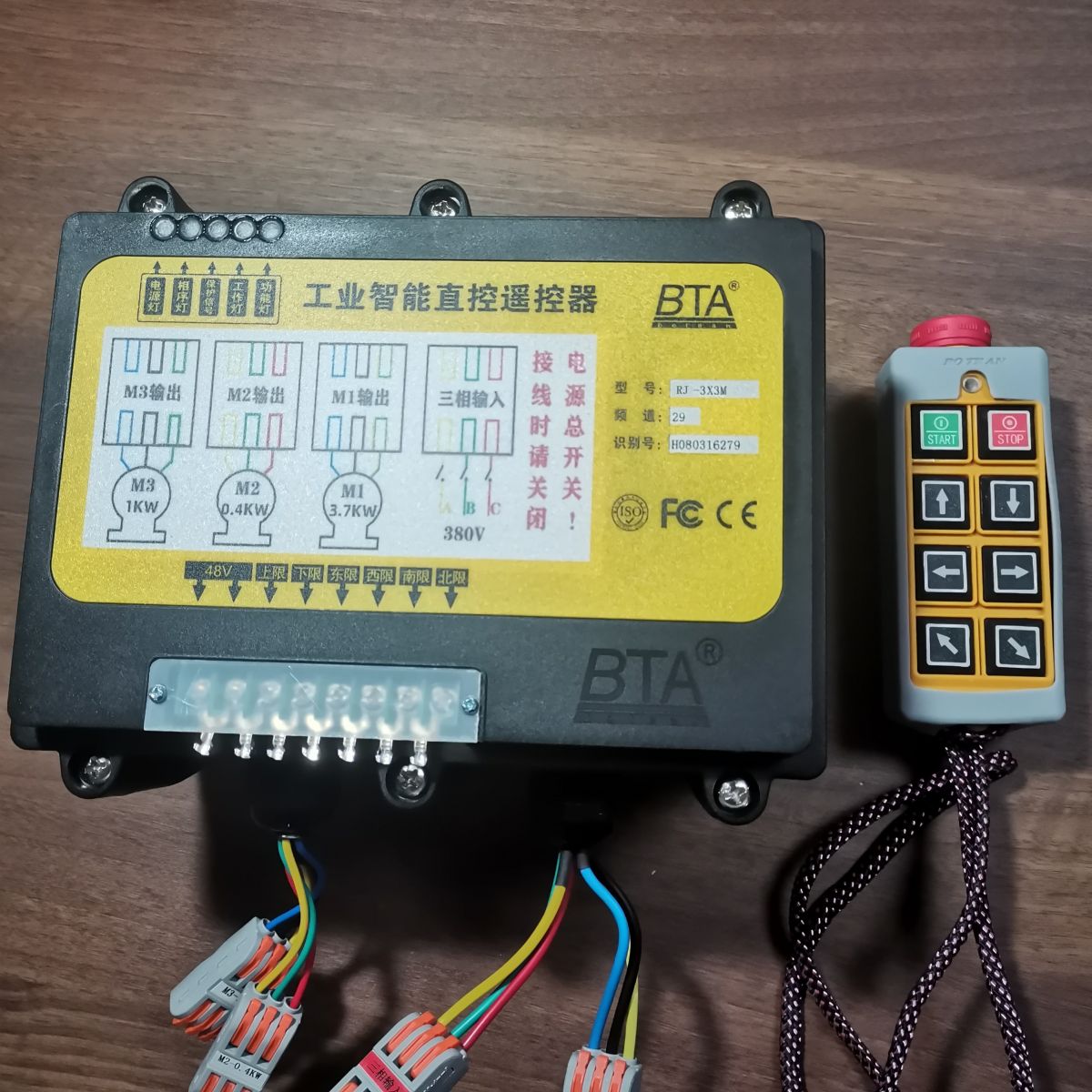RJ-3X3M工業(yè)智能直控遙控器是我公司針對小型環(huán)鏈電動葫蘆、鋼絲繩電動葫蘆起重機研制的一款控制箱+遙控接收裝置。本工業(yè)智能直控遙控器集成了電動葫蘆控制箱和遙控器雙重功能,接收機內(nèi)部設(shè)置了經(jīng)過特殊消弧處理的大電流控制觸點,可以經(jīng)受點擊長期頻繁作業(yè)考驗。同時,接收機具有缺相及相序保護功能和指示,每個方向均有限位輸入;可串接各種安全保護開關(guān)(客戶自備)。